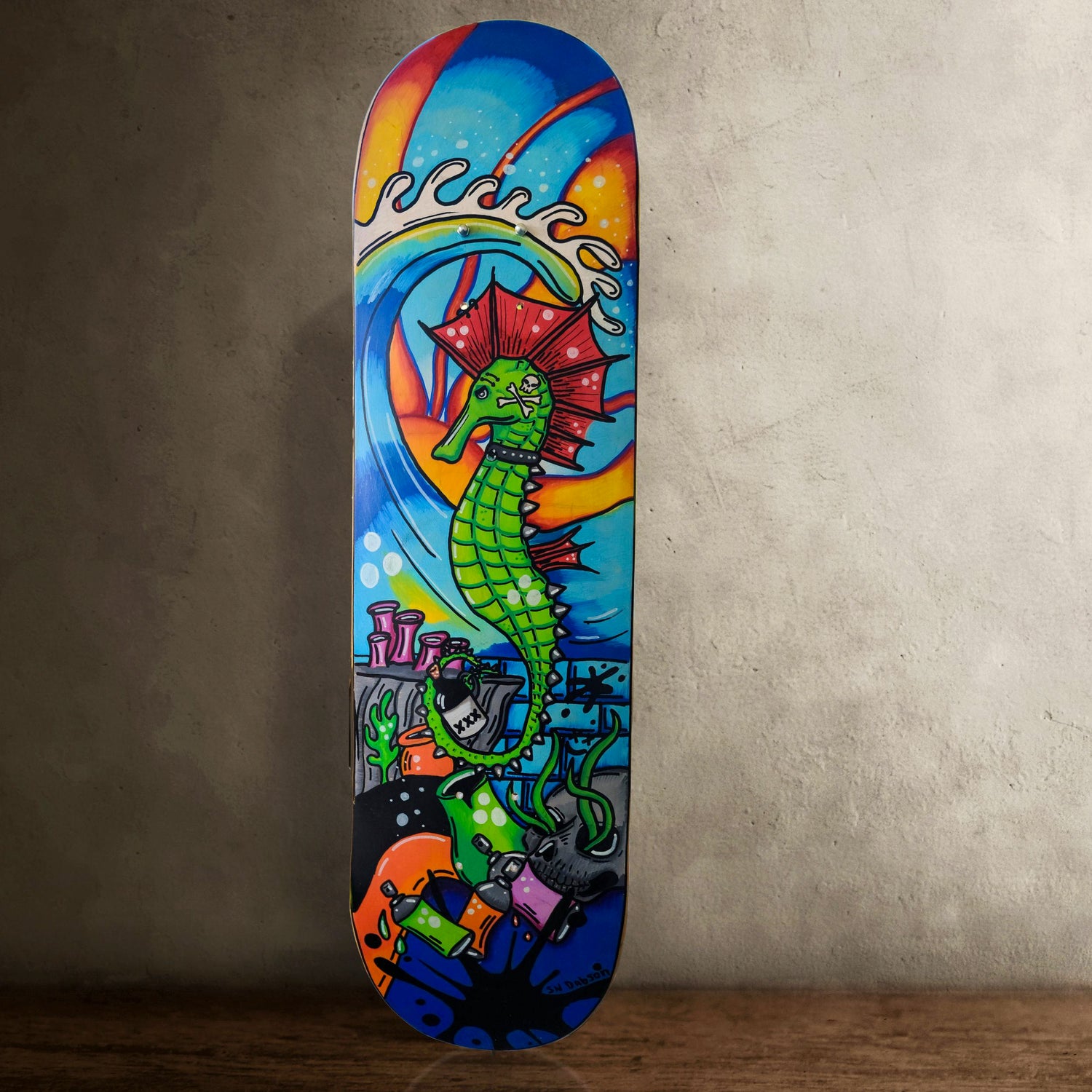 Hippocampus shows a punk rock seahorse who just got done adding a little extra color to the ocean. 8.5x33 skateboard. This board is sealed and could be used for skating, however it could be scratched if used for grinding or if it is scraped on concrete surfaces. It's totally up to you if you want to use it functionally or for awesome art in your home.