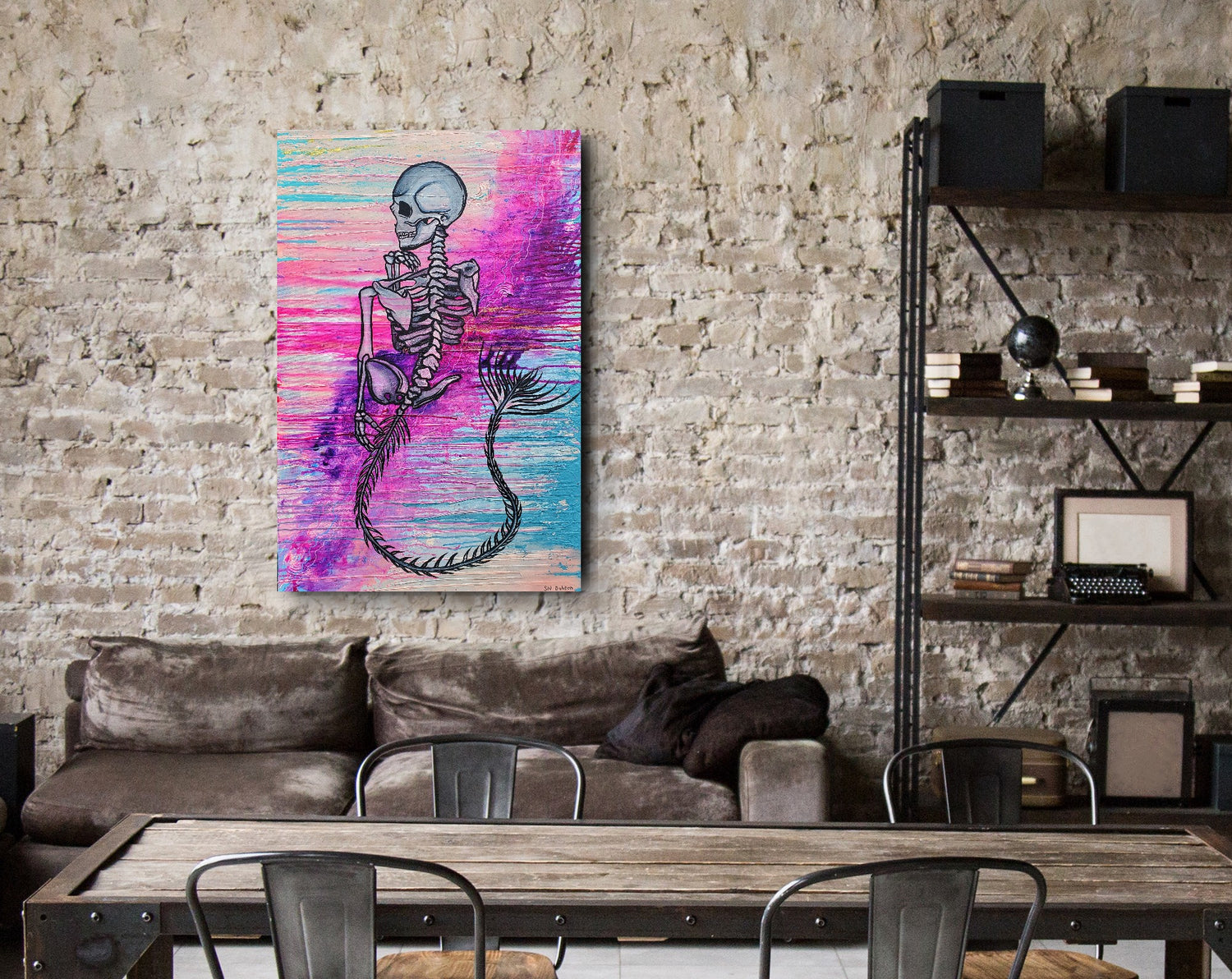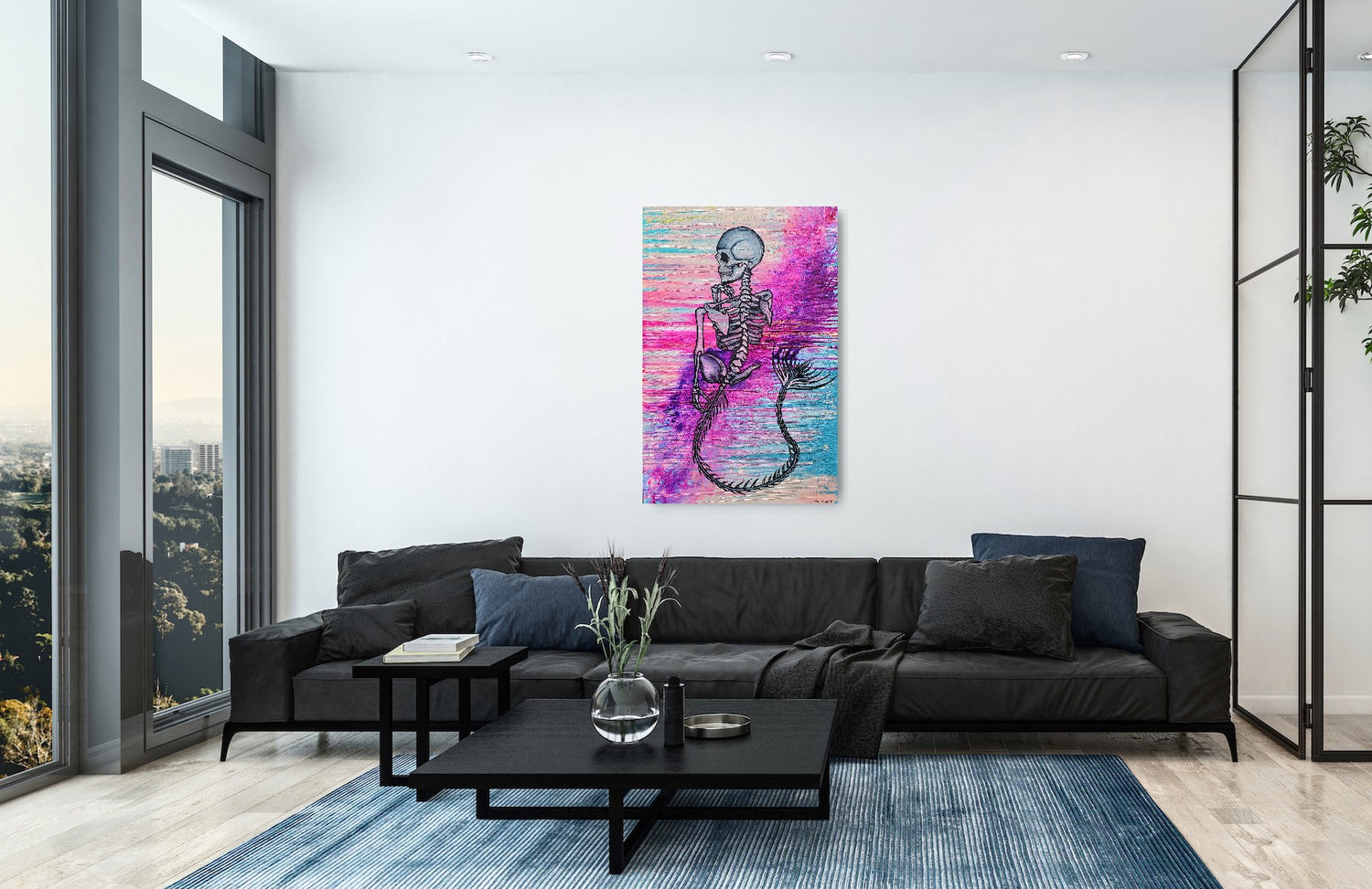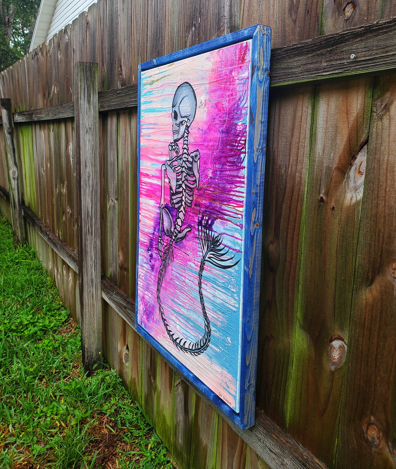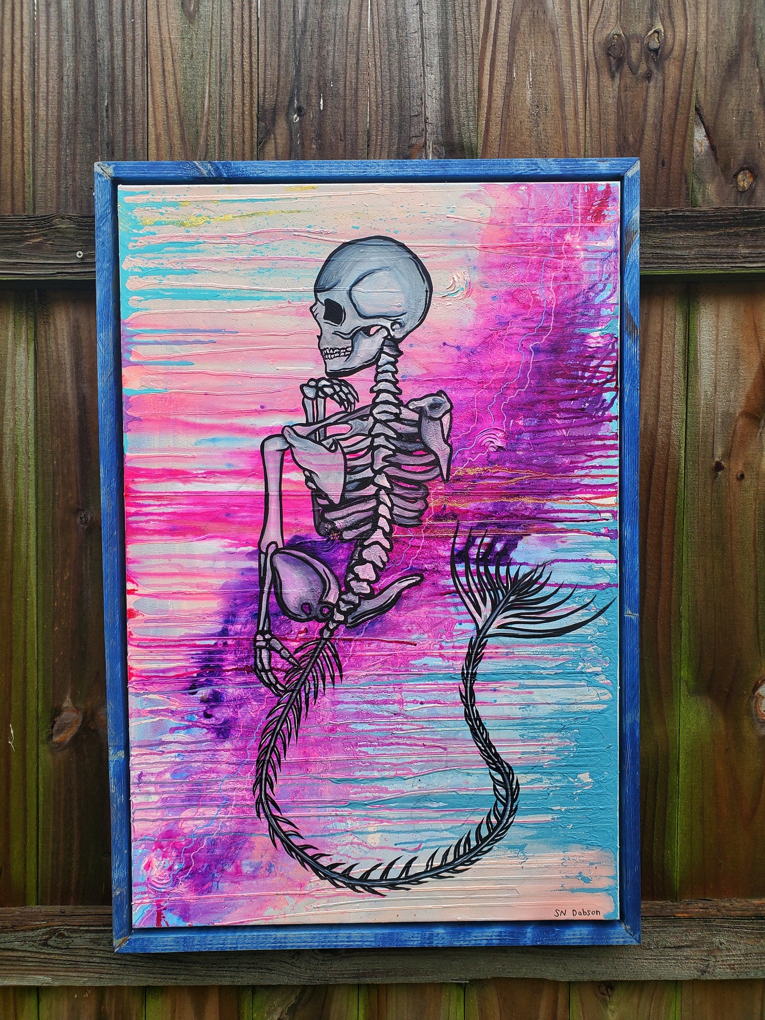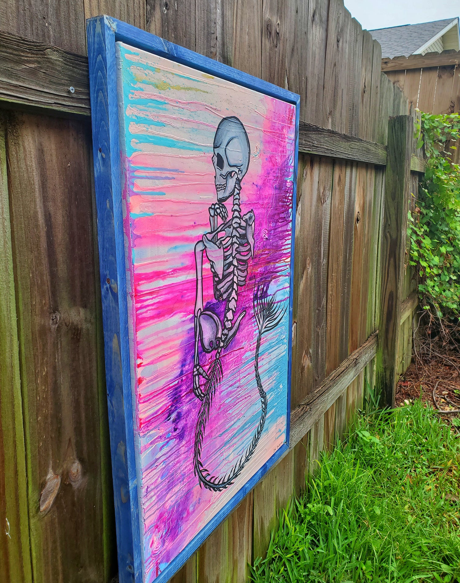 Just Keep Swimming is a unique and eye catching piece that offers the artists interpretation of a mermaid skeleton. It is brightly colored, textured, and a great conversation starter. This piece is mounted on a hand-built wooden frame with a blue stain. It is wire hung and will hang easily on any wall. This is a large piece and we highly recommend placing in a wall that is able to hold the weight to avoid damaging the art or the wall.