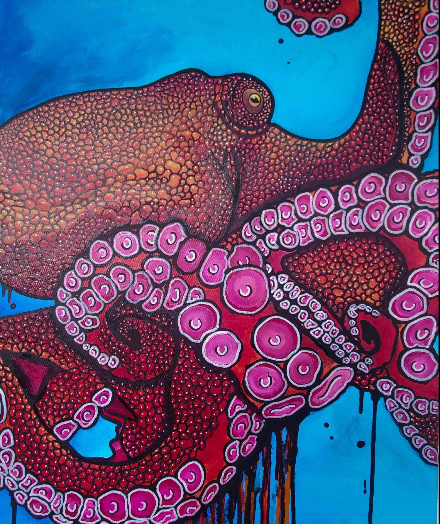Resilience tells the story of challenging oneself to stay focused on what matters and gathering inner strength. The octopus is cunning, flexible, and willing to give up everything for those that truly matter. This is a 20x24 original painting on 1.5 in canvas. It is framed with a hand built wooden frame with a black stain.