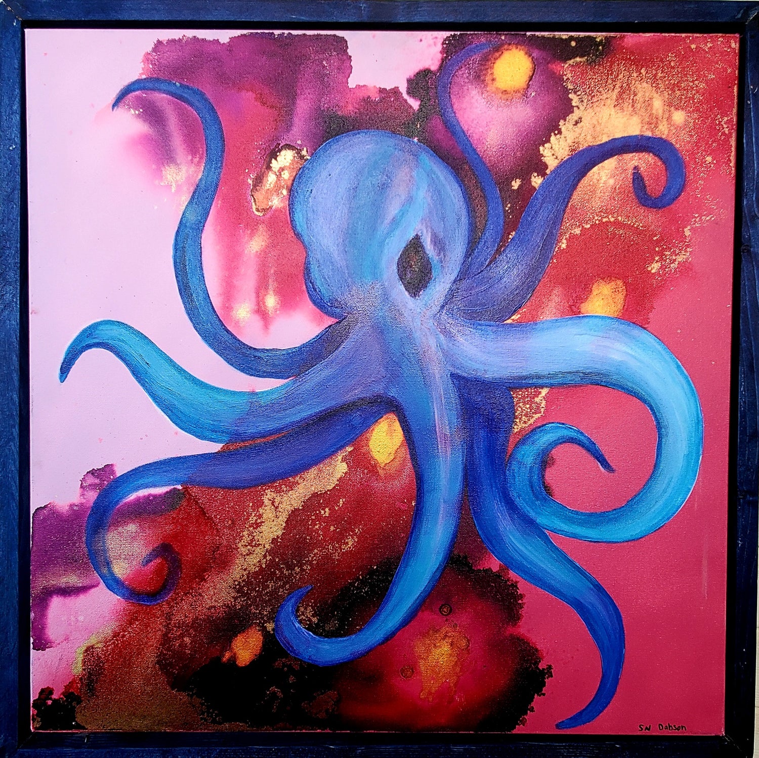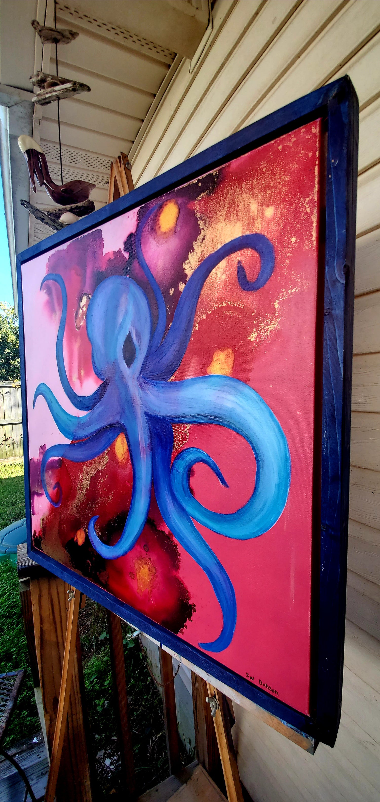 24x24 (without frame) This piece is framed with a hand-built wooden frame with a blue stain made by Thomas Dabson.