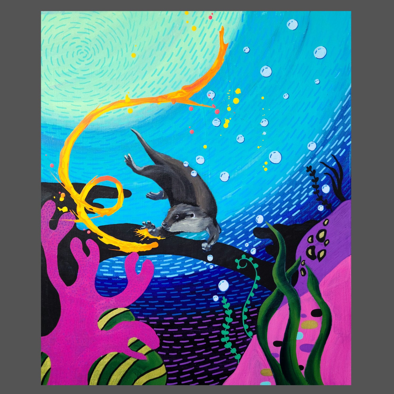 Start the Fire is a 20x24 acrylic painting on canvas with a blue stained wooden frame. This piece was part of the 2021 Coral series. Featuring a playful otter chasing a ray of light.
