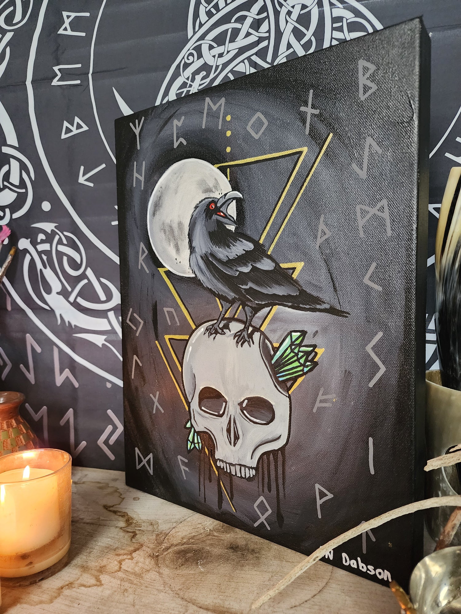12x16 in original acrylic painting on 1.5 in canvas. Features a raven sitting on top of a skull with crystals in front of the moon. This piece is wire hung and ready to go on your wall.