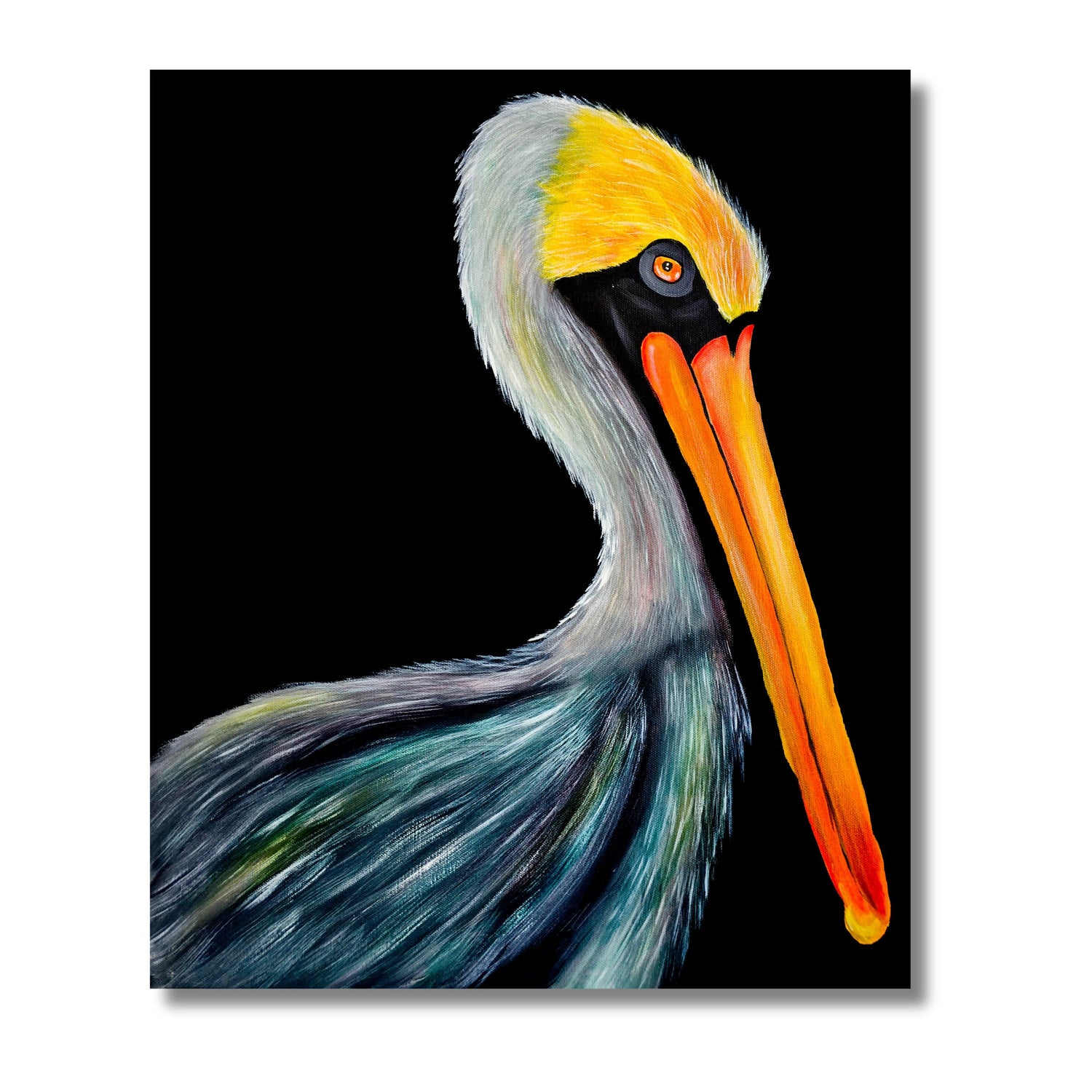 20x24 Acrylic on canvas. This Pelican appears to be glowing on the dark background in person (even though she doesn't technically glow in the dark). This piece is wire hung and ready to go on your wall!